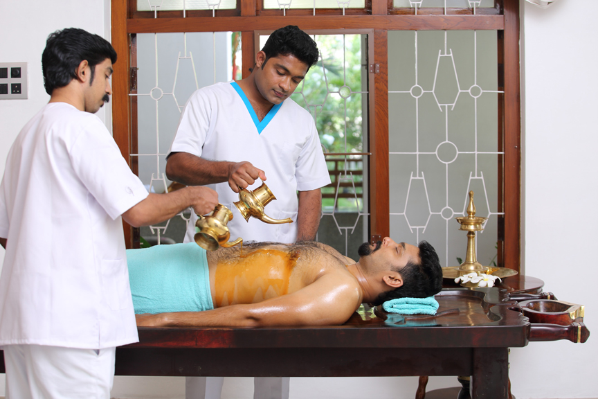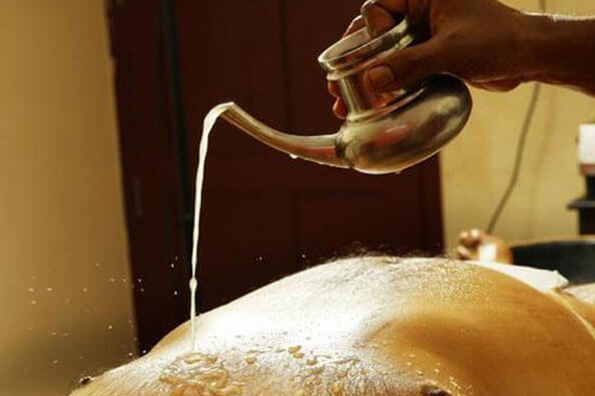 The bundle of cloth would be dipped into the heated oil and then squeezed slowly or using Dhara pots. This Pizhichil treatment is useful for rheumatic diseases like arthritis, paralysis, hemiplegia, paralysis , sexual weakness, nervous weakness and nervous disorders etc