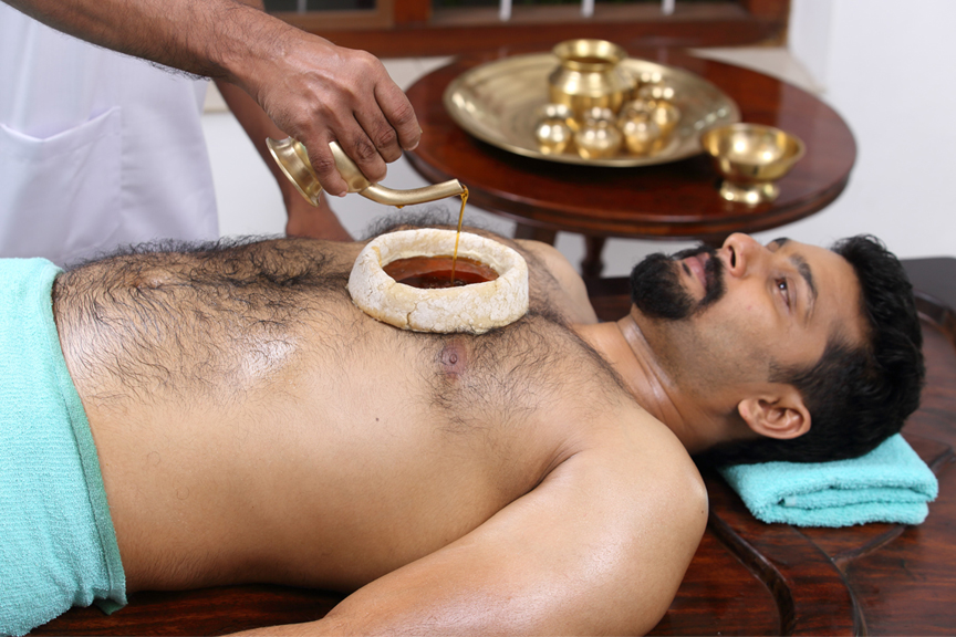 Medicated oil or powder mixed with oil or medicated ghee is applied on the head mainly on and around the bregma region and sustained for a particular period of time. This therapy is useful for relieving from anxiety, disorders related to eyes nose and throat. It is found beneficial in insomnia, mental disorders, migraine. It brings about a feeling of wellness. It is even found effective in alleviating hyper tension. It improves memory and concentration.